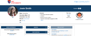 In the fall, Mary gets started by creating her portfolio. Since Mary is already a Junior, she wants to get started quickly because she has looked at the department’s PRO Community site and understands that the portfolio is very important to her success. Mary uses the tips and tools on the site to start a portfolio and get 50 points. The Dashboard, which is private and unique to Mary, also allows her to compare her progress with other students and track her professional development progress toward graduation.